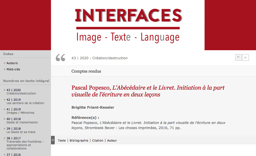 Les circonstances ne m’ont pas permis de vous informer de sa parution en juillet, mais c’est avec grand plaisir que je reviens vers vous pour vous annoncer que le livre L’Abécédaire et le Livret – Initiation à la part visuelle de l’écriture en deux leçons a fait l’objet d’une recension (d’un article critique) dans la revue Interfaces.