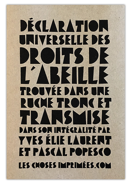 - La Déclaration universelle des droits de l’abeille trouvée dans une ruche tronc et transmise dans son intégralité par Yves Élie Laurent et Pascal Popesco
