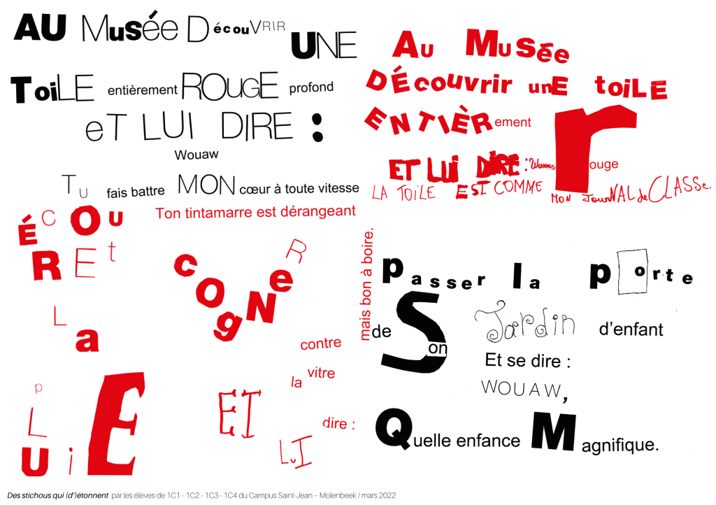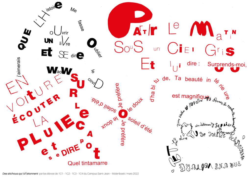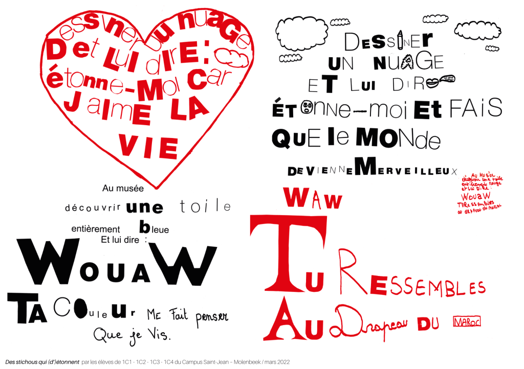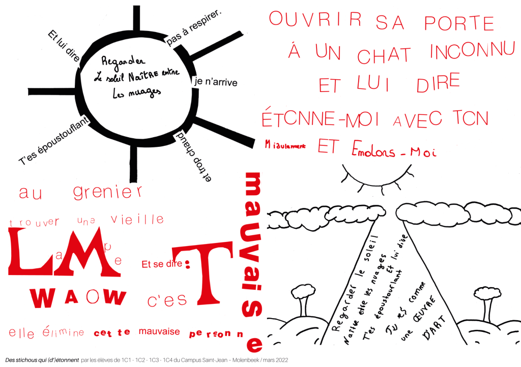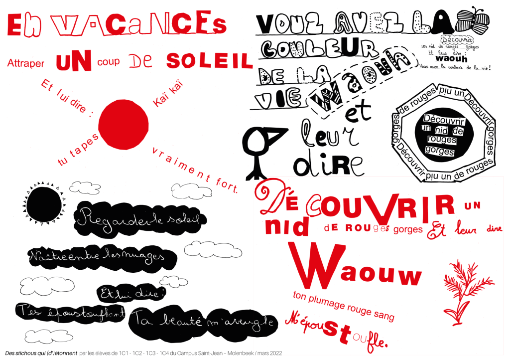 Cette forme littéraire s’adapte idéalement à des ateliers d’écritures. Depuis cinq ans, les élèves de première année secondaire du Campus Saint-Jean de Molenbeek se sont lancés dans l’aventure des Stichous.