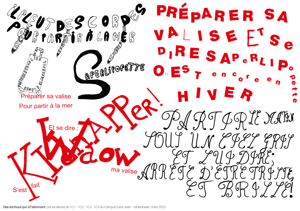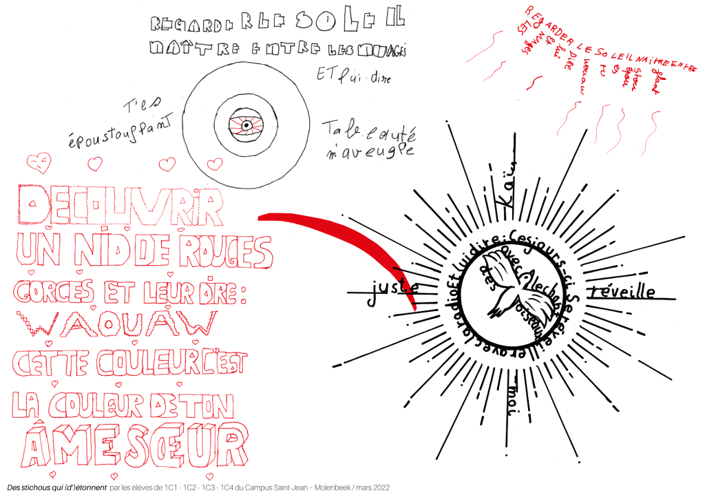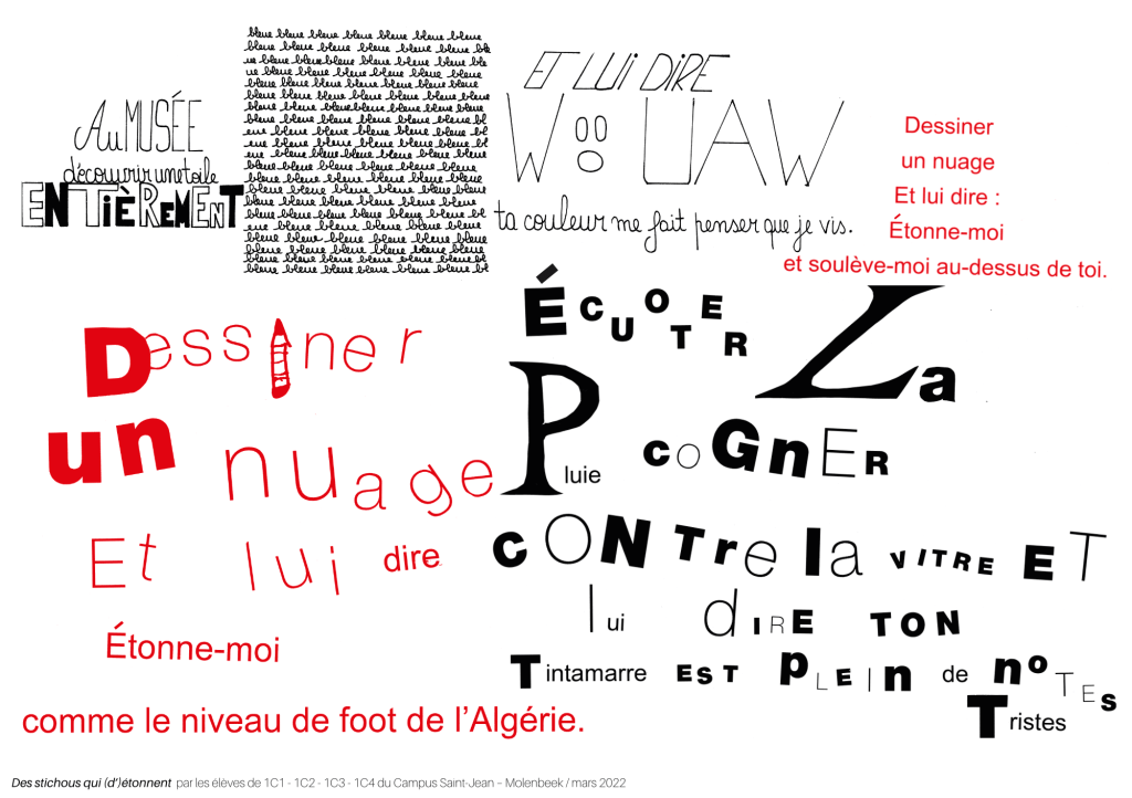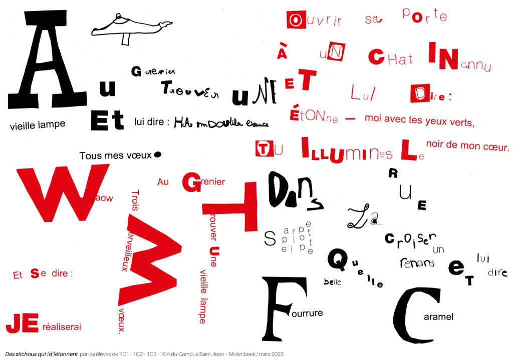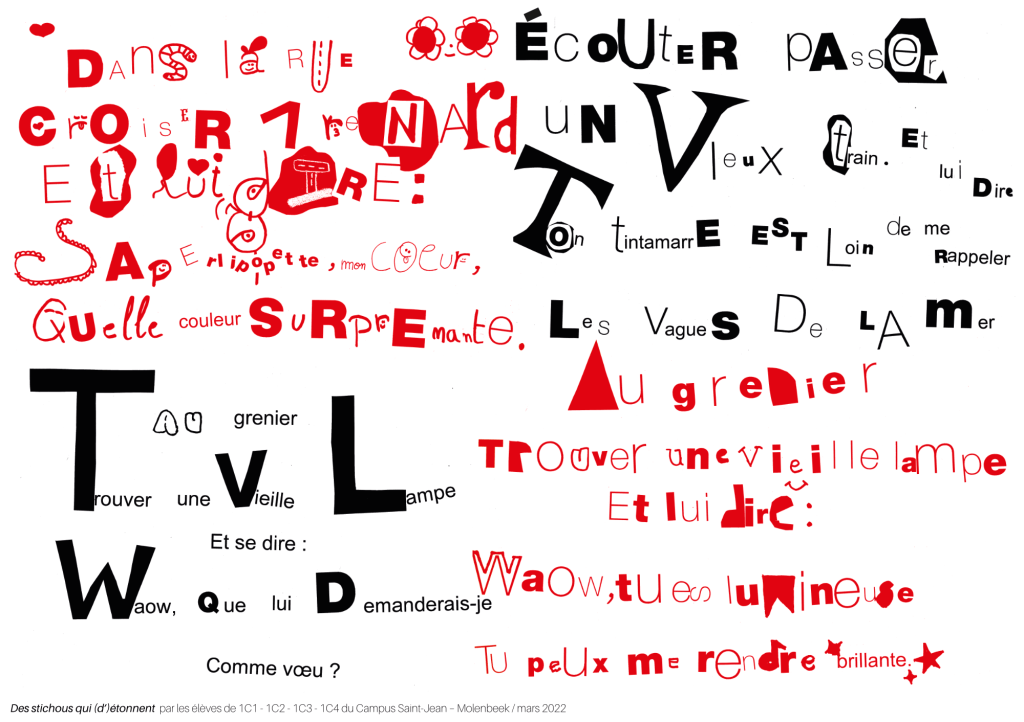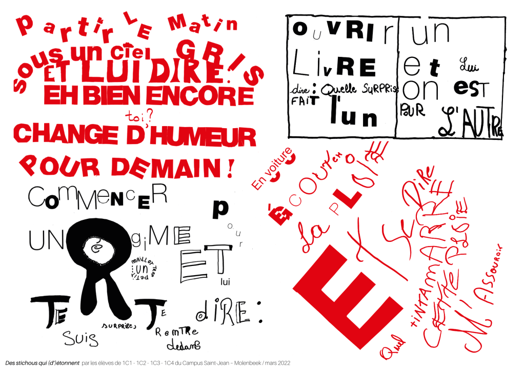 En janvier, Isabelle Bielecki a proposé, avec un même enthousiasme et un même bonheur, ses ateliers d’écritures à quatre nouvelles classes. Basés sur les « Dix mots qui détonent !» choisis par la Fédération Wallonie Bruxelles comme thématique dans le cadre de la «Semaine de la langue française en fête», ce ne sont pas moins de 80 Stichous, d’une grande richesse et d’une grande diversité, qui ont été proposés par nos jeunes poétesses et poètes, grâce aux accompagnements d’Isabelle.