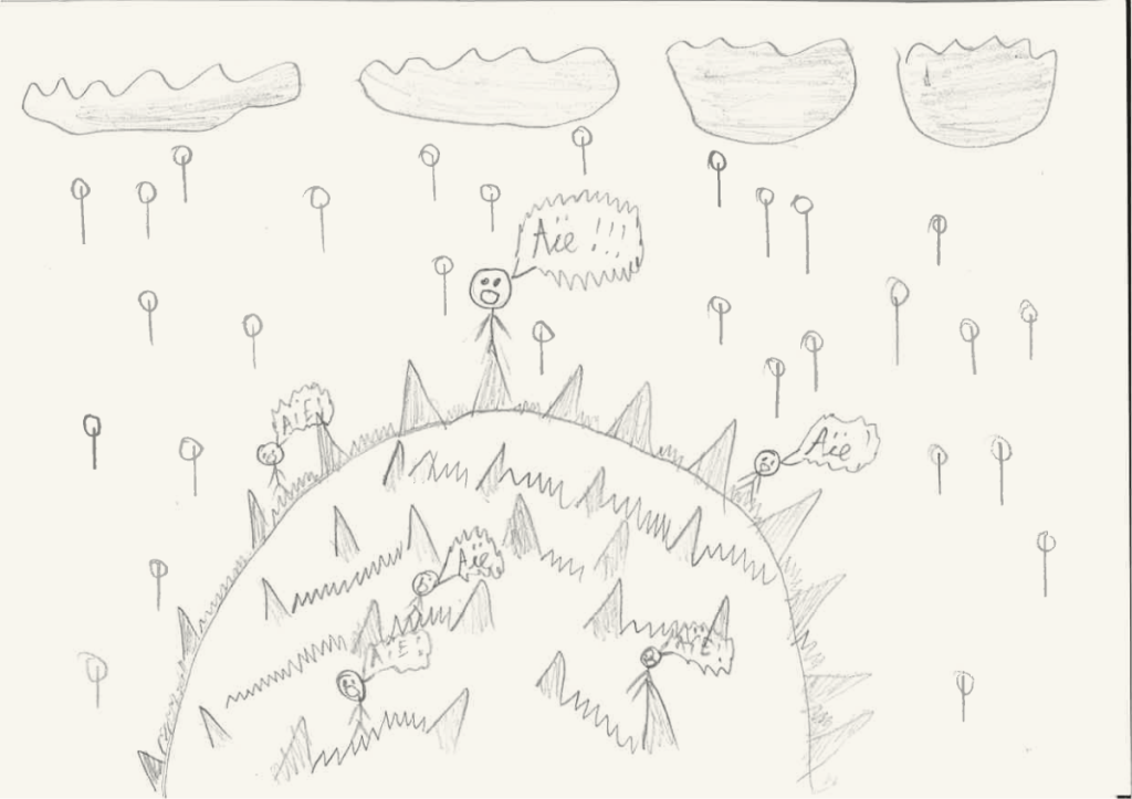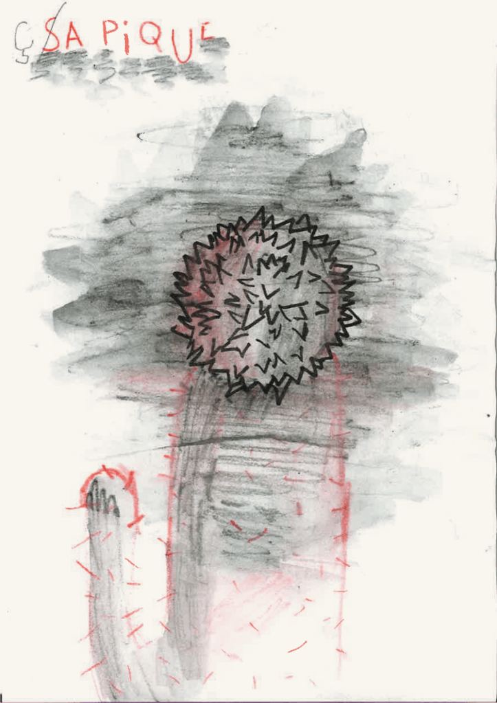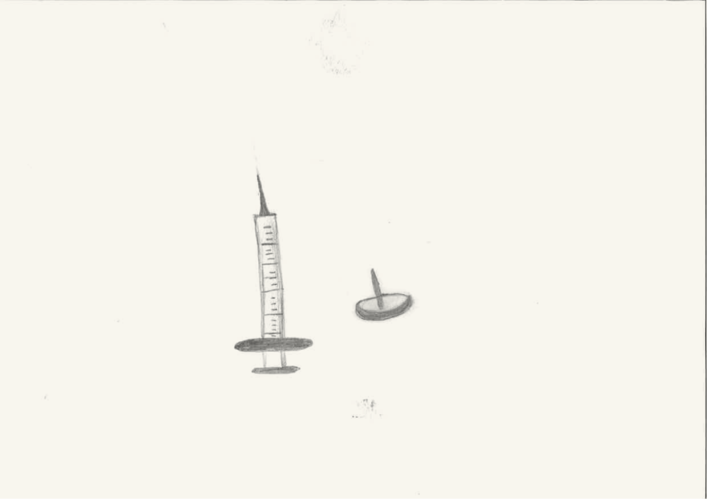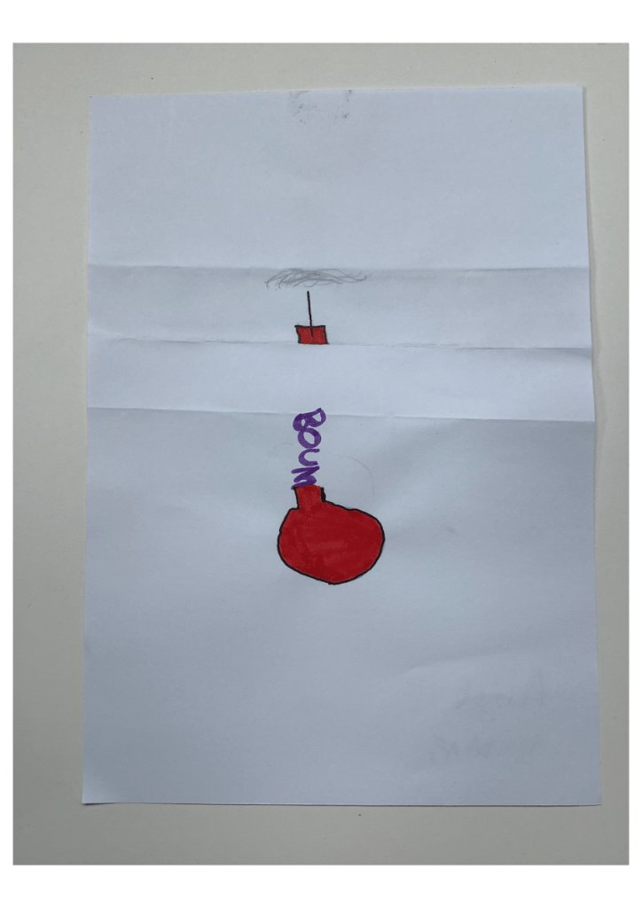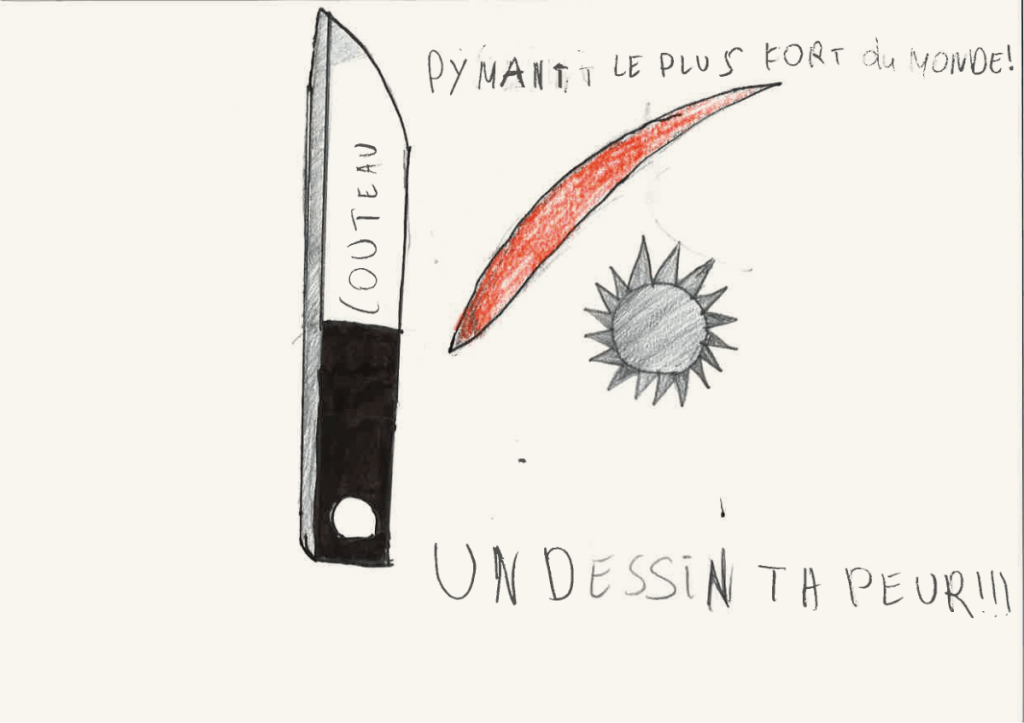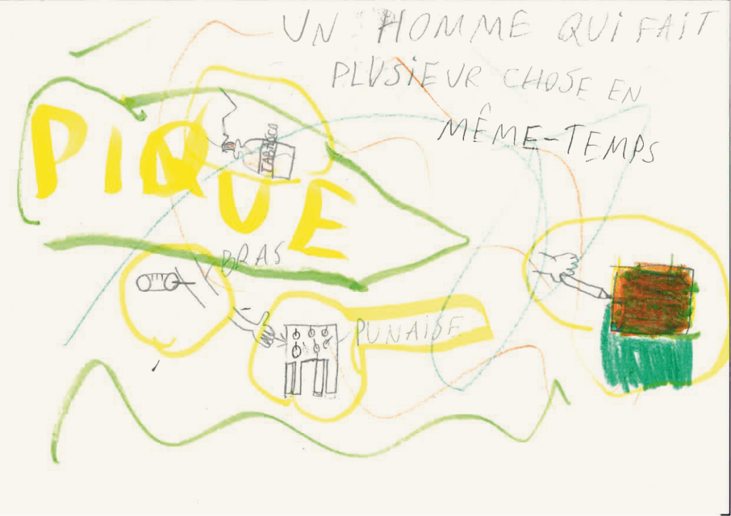 Et si elle ne s’est pas présentée ce jour, vous pouvez toujours leur montrer ce que le gagnant du défi « Un dessin qui pique » avait proposé l’année dernière. À la 14e minute, il a pris une punaise qu’il a fichée dans son A5 et m’a dit: « Voilà, monsieur, un dessin qui pique !»