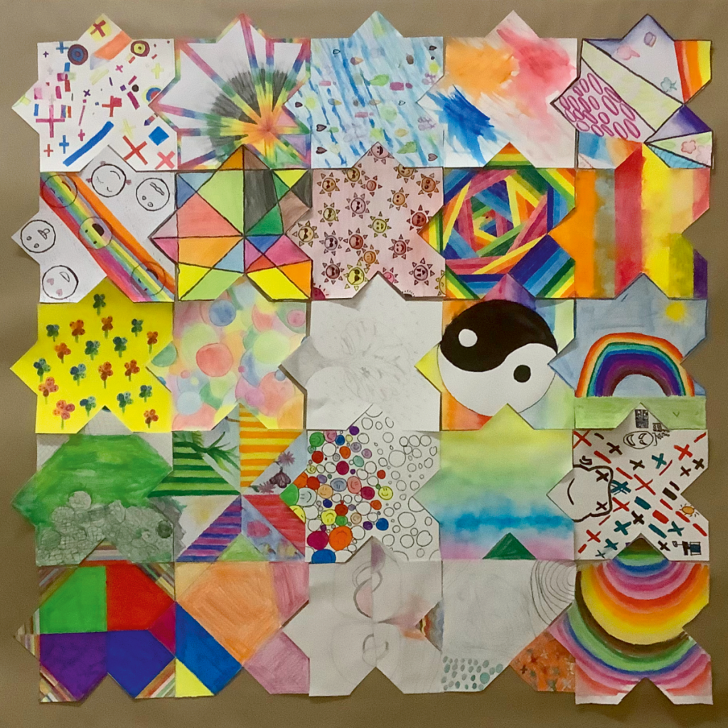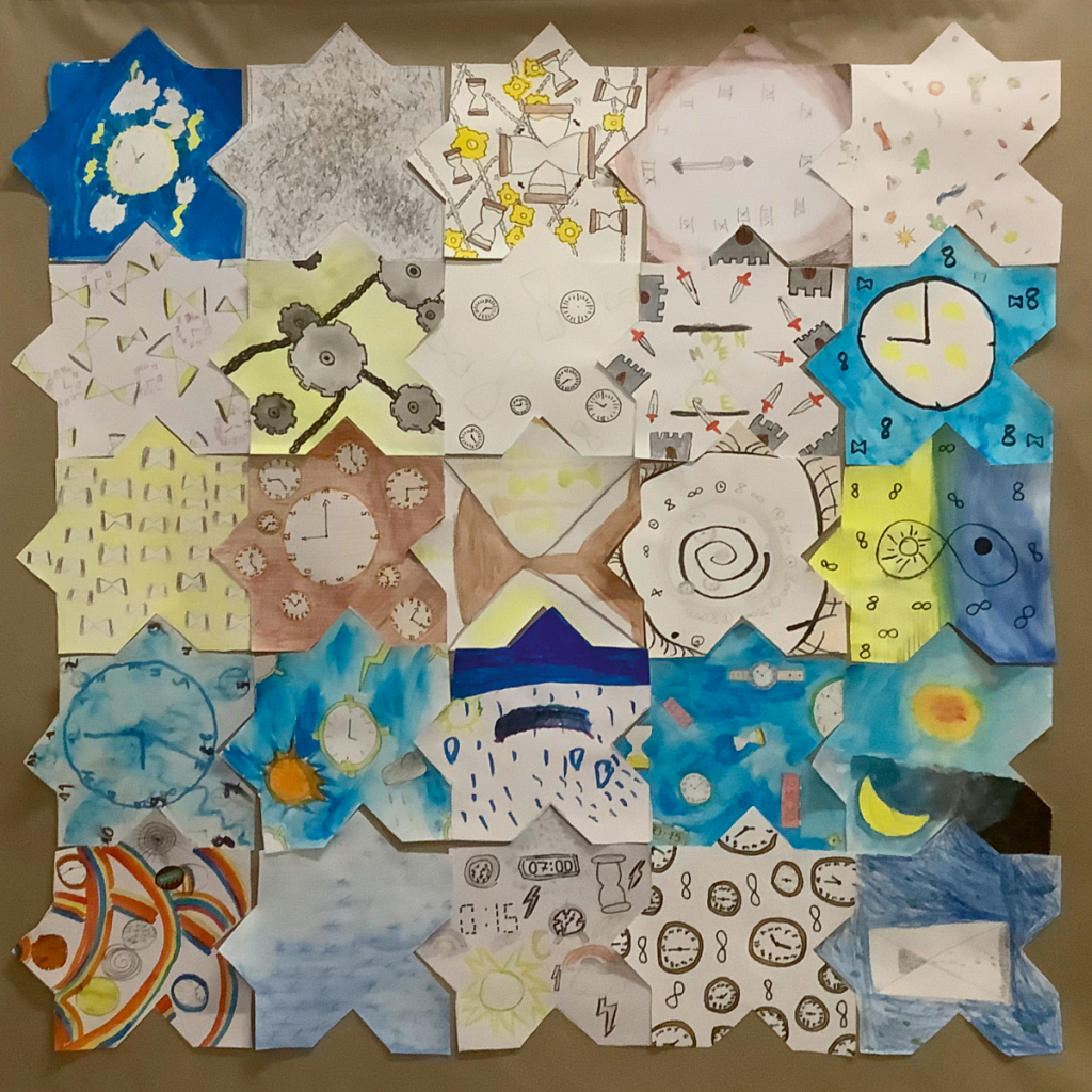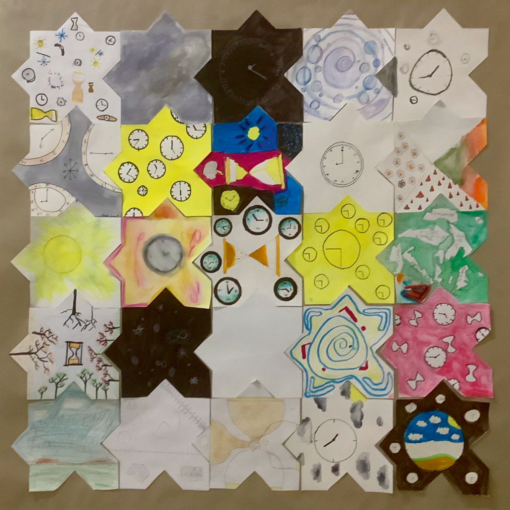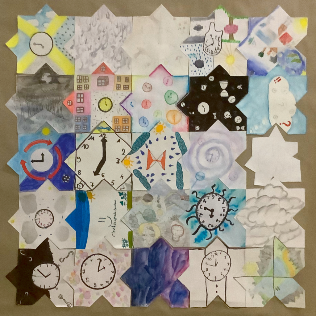 L’objectif de cet exercice est de réaliser et d’exposer un certain nombre de tapis composé de ±25 morceaux réalisés par chacun des élèves. Et bien évidemment ces tapis disent quelque chose. Cette année, nous avions au programme un « Tapis de bonheur », un « Tapis sauvage » et un « Tapis de temps ».