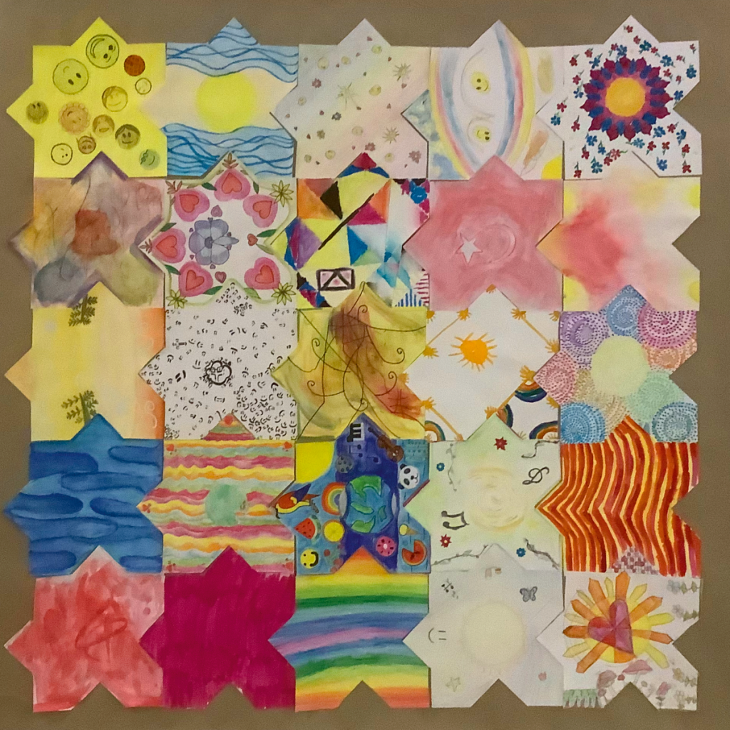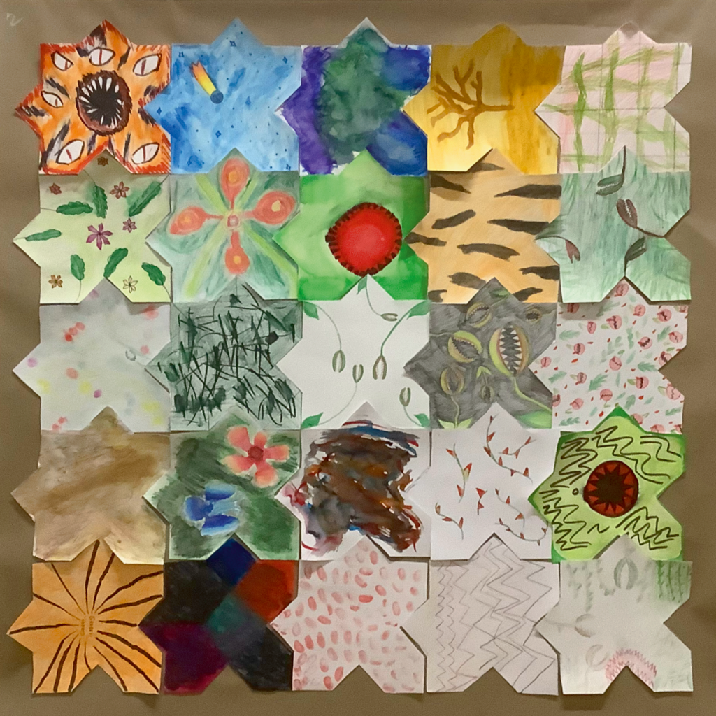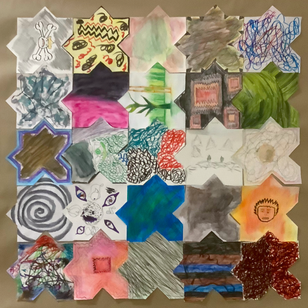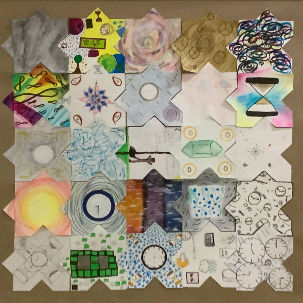 L’objectif de cet exercice est de réaliser et d’exposer un certain nombre de tapis composé de ±25 morceaux réalisés par chacun des élèves. Et bien évidemment ces tapis disent quelque chose. Cette année, nous avions au programme un « Tapis de bonheur », un « Tapis sauvage » et un « Tapis de temps ».