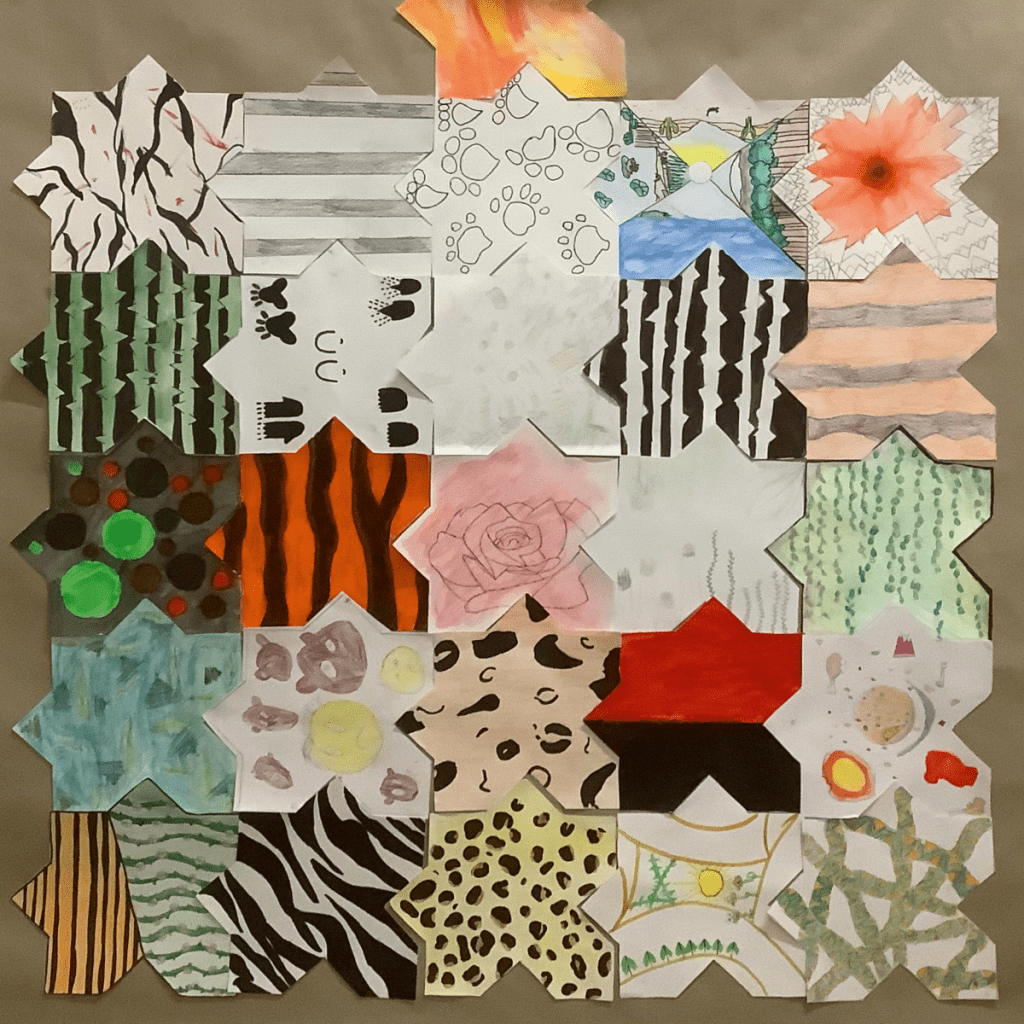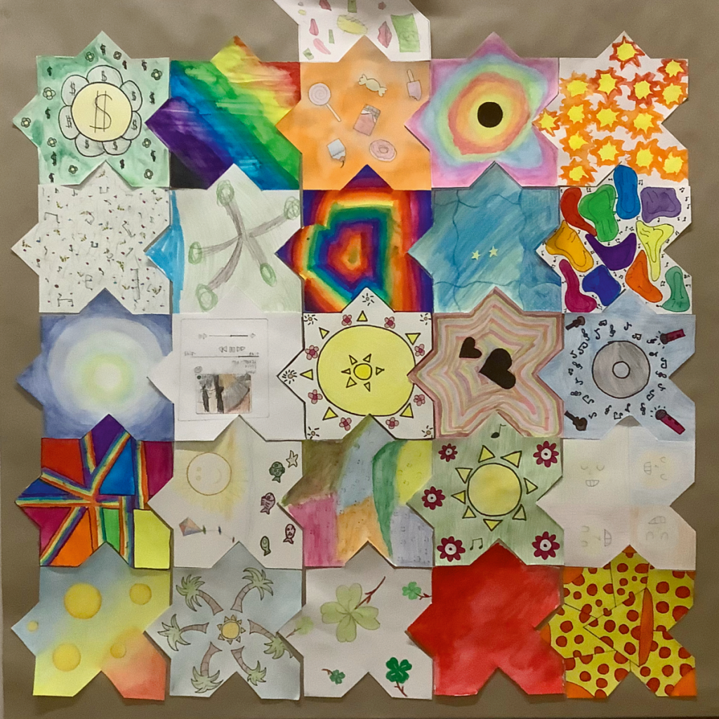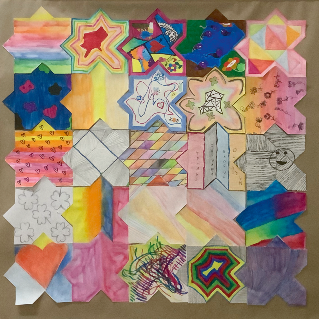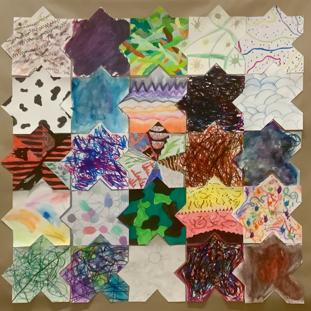 L’objectif de cet exercice est de réaliser et d’exposer un certain nombre de tapis composé de ±25 morceaux réalisés par chacun des élèves. Et bien évidemment ces tapis disent quelque chose. Cette année, nous avions au programme un « Tapis de bonheur », un « Tapis sauvage » et un « Tapis de temps ».