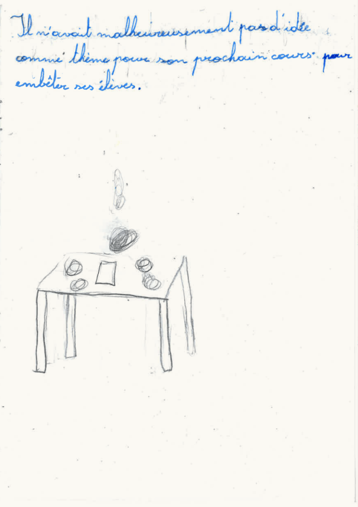 Je vous renvoie au premier article en ce qui concerne les spécificités administratives de l’option « 2e année Activité complémentaire Art ». Selon les années et malgré la notion de choix d’option, les motivations et les compétences du groupe classe ne sont pas homogènes. De plus, ce groupe est issu d’au moins deux classes différentes. J’ai été surpris lors de la partie écriture de l’exercice (donc en fin d’année) de constater que des élèves ne connaissaient pas leur prénom mutuel… Difficile de partager la construction d’une histoire avec quelqu’un que l’on ne connaît pas. S’ajoute à cela les difficultés qu’ils éprouvent à imaginer qu’il est possible d’écrire une histoire à plusieurs, sans parler de la pertinence de prendre du temps à cela dans la cadre d’un cours d’art plastique. Si pour moi la réponse est évidente, il s’agira de la faire partager avant de commencer une nouvelle aventure.