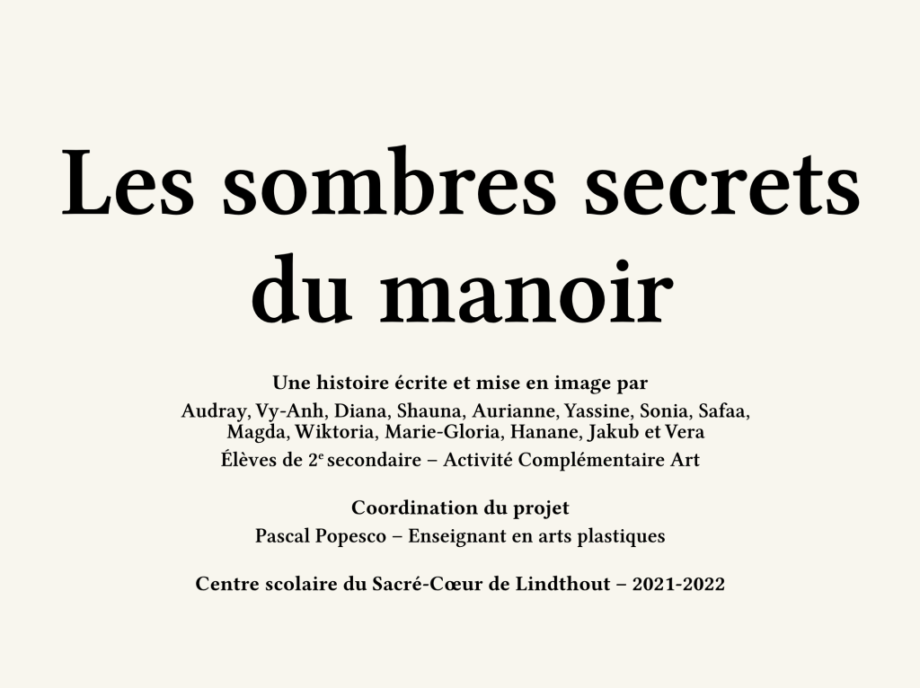 Encore merci à Clotilde, Joséphine, Amina, Audray, Vy-Anh, Diana, Shauna, Aurianne, Yassine, Sonia, Safaa, Magda, Wiktoria, Marie-Gloria, Hanane, Jakub, Vera, ainsi qu’à tous les élèves de 1re et 2e année en activité artistique des promotions 2020-2021 et 2021-2022 pour leur travail et leur patience. Ce fut un plaisir et un honneur.