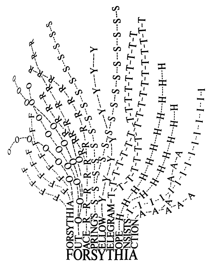 Dernière grande personne, loin d’être la moindre, celle que j’ai choisie pour illustrer et représenter à elle seule l’infinité des possibles des poésies concrètes/typoésies/calligrammes/logogrammes et autres fantaisies d’écriture: Mary Ellen Solt, auteure de Forsythia (1966).
