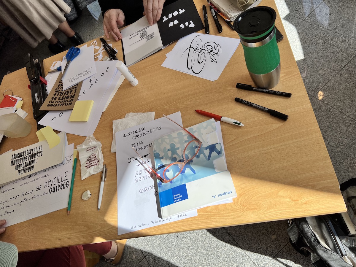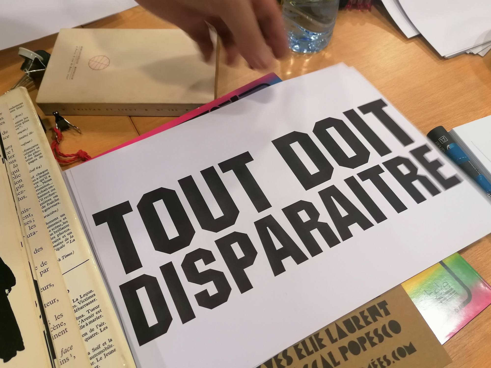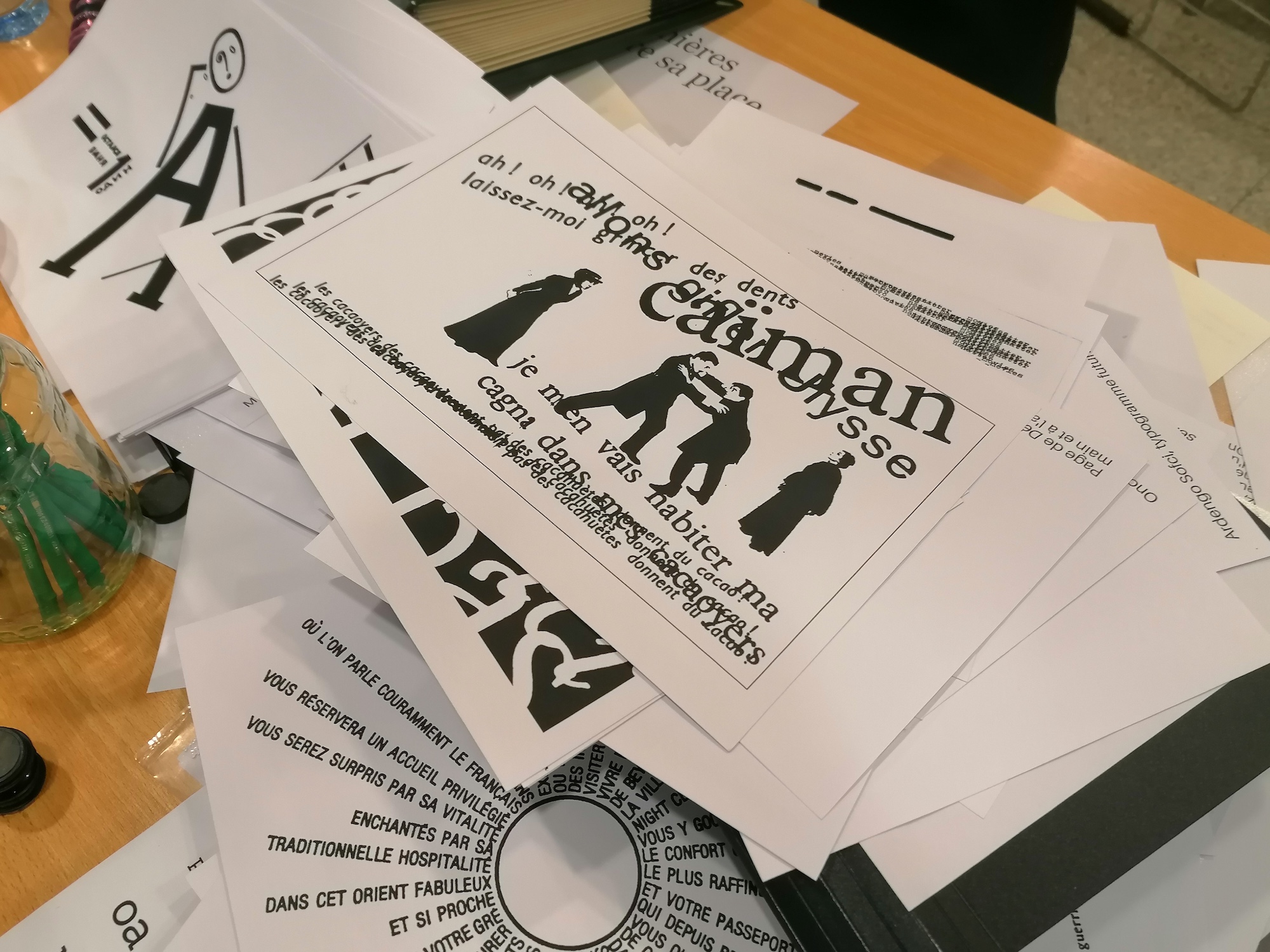 Nous fournirons un matériel de dessin/découpage/lettrage de base, des catalogues typographiques, plein de superbes exemples, notre bonne humeur et surtout notre intelligence collective, pour voir tous ensemble l’effet que font nos choix de lettrage et de mise en page sur nos paroles.