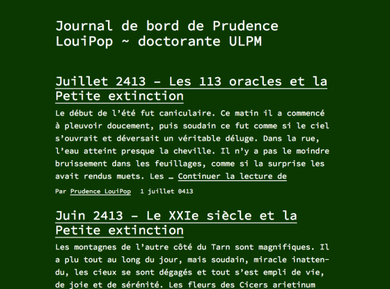 La gazette des choses imprimées vous invite à consulter le journal de bord de Prudence LouiPop en direct de 2413. … Plus