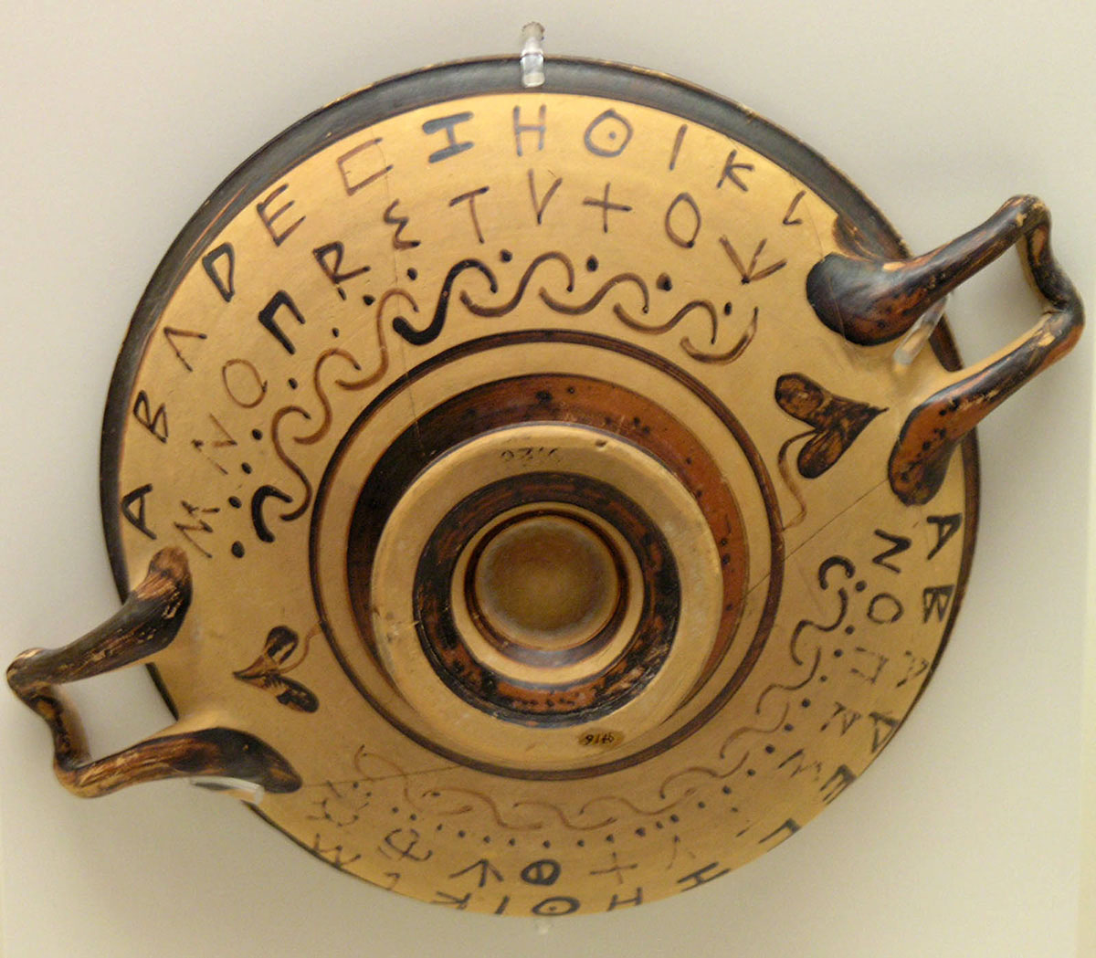 Coupe Attique 29 janvier 2015Pleine résolution (1200 × 1049) Alphabet grec archaïque peint sur la panse d’une coupe attique – (CC BY-SA 3.0) Marsyas